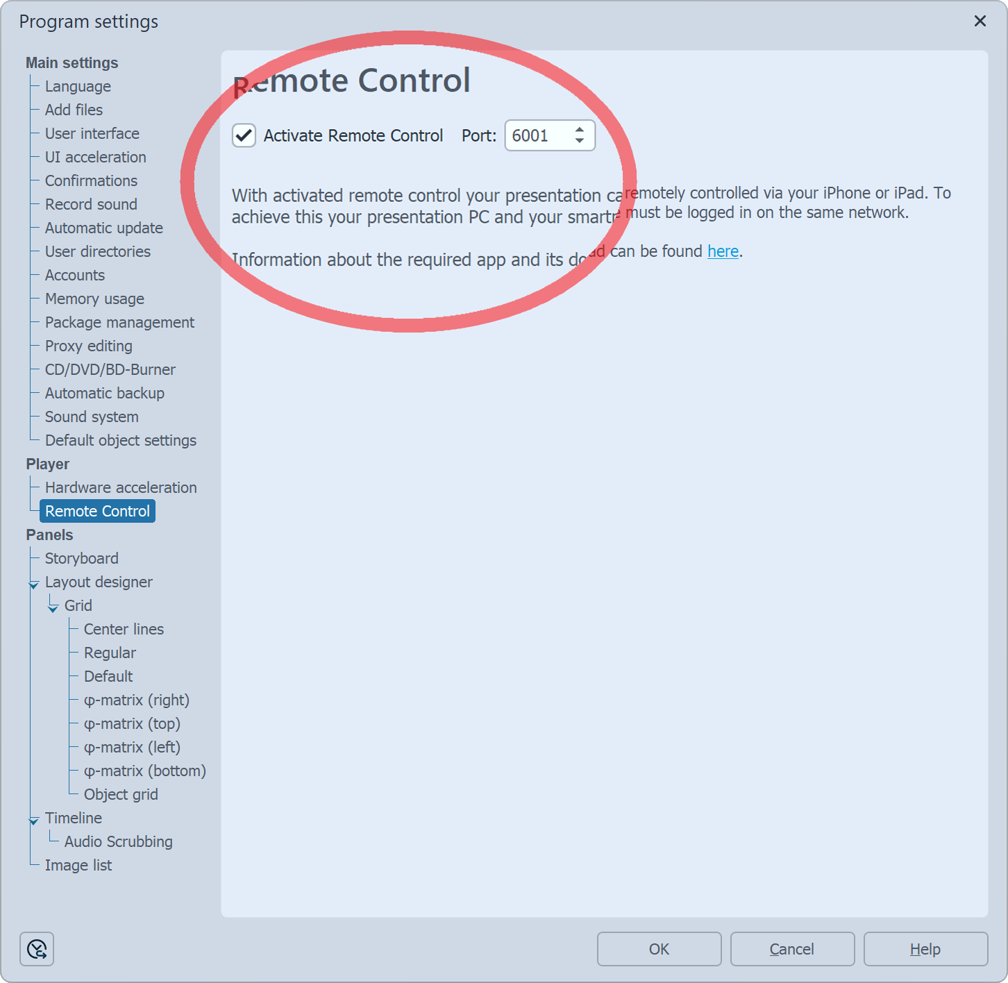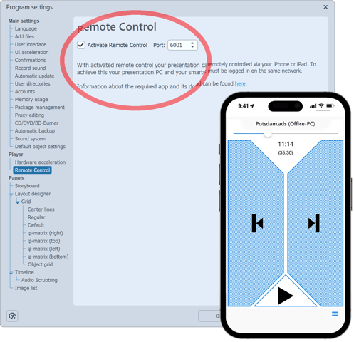 Activate the remote control in the program under "Extras" - "Program settings" - "Player". Then start the player from Vision, Stages, or SlideShow and you can now control it from your Apple device.