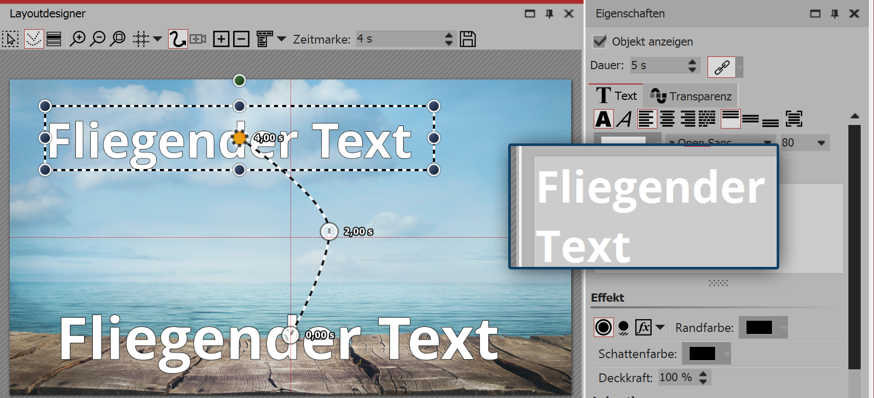 2. Creating a motion path![]() Motion path of the text in the layout designer In order now to move the text, insert a new motion marker with the squared plus icon. In the Layout designer position the markers to your liking. Then insert further motion markers with the squared plus icon and, in this way, create your motion path. |