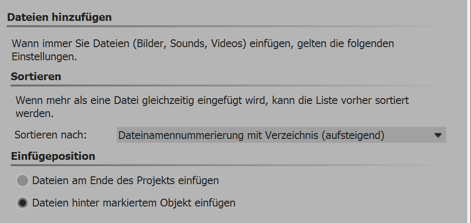 ![]() Allows you to set both the sorting order when you insert multiple files and the place you insert them. |