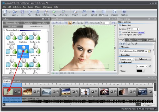 SlideShow provides predefined Movement paths in the Toolbox. Among them you can find the Ken Burns Effect. Drag the Ken Burns Effect from the Toolbox directly to an image in the Timeline. Now play that image. There are many more options to animate images with zooms and camera pans. You can find more information about this at a later point in this manual. 9. Image effects