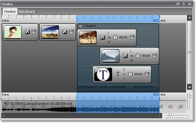 Extend the duration of the first image to 10 seconds. To do this simply drag the right edge of the preview image farther to the right. Then move the second image to the right also using the mouse. Extend the text and move it inside the Timeline a few seconds to the right. Select the Chapter and click the ... from here -button. The text appears after the first image has been displayed for a few seconds and will be shown with an animation. In this example the text will also be shown in the second image. 14. Chapters can do even more
