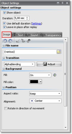 Now select Alphablending as Transition in the Image Object settings. The Fill function has to be enabled as well.