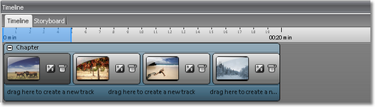 In AquaSoft ® SlideShow at first glance you only see an image and music track on the Timeline. This serves to provide a better overview. At positions where you require multiple tracks, the Chapter object is used. With this you can connect as many tracks as you want. In that respect, it is not predetermined which objects can contain a track. Therefore you can place images, music or texts on any track. You will find the Chapter object in the Toolbox under Slideshow objects.