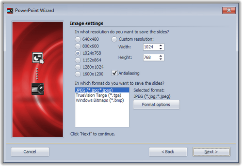 Click Next. Now you can set the image options. Select the desired resolution and the image format. Under Format options you can configure additional settings relating to the image format.