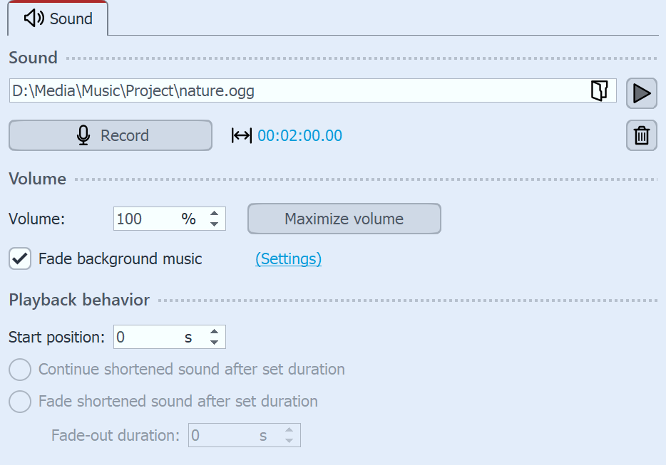 If you want to play the sound only for a certain time and then stop it, you must select this option. Under Fade-out duration you can set the time that the sound may need to fade out smoothly. |