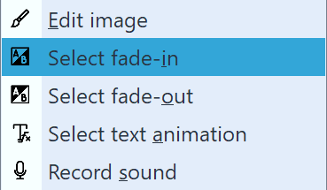 ![]() Set Fade-in or Fade-out from the context menue If you right-click on an object in the Timeline, the context menu opens. There you will find a selection point for Fade-in and for Fade-out, which you can use to specify the desired fading. |