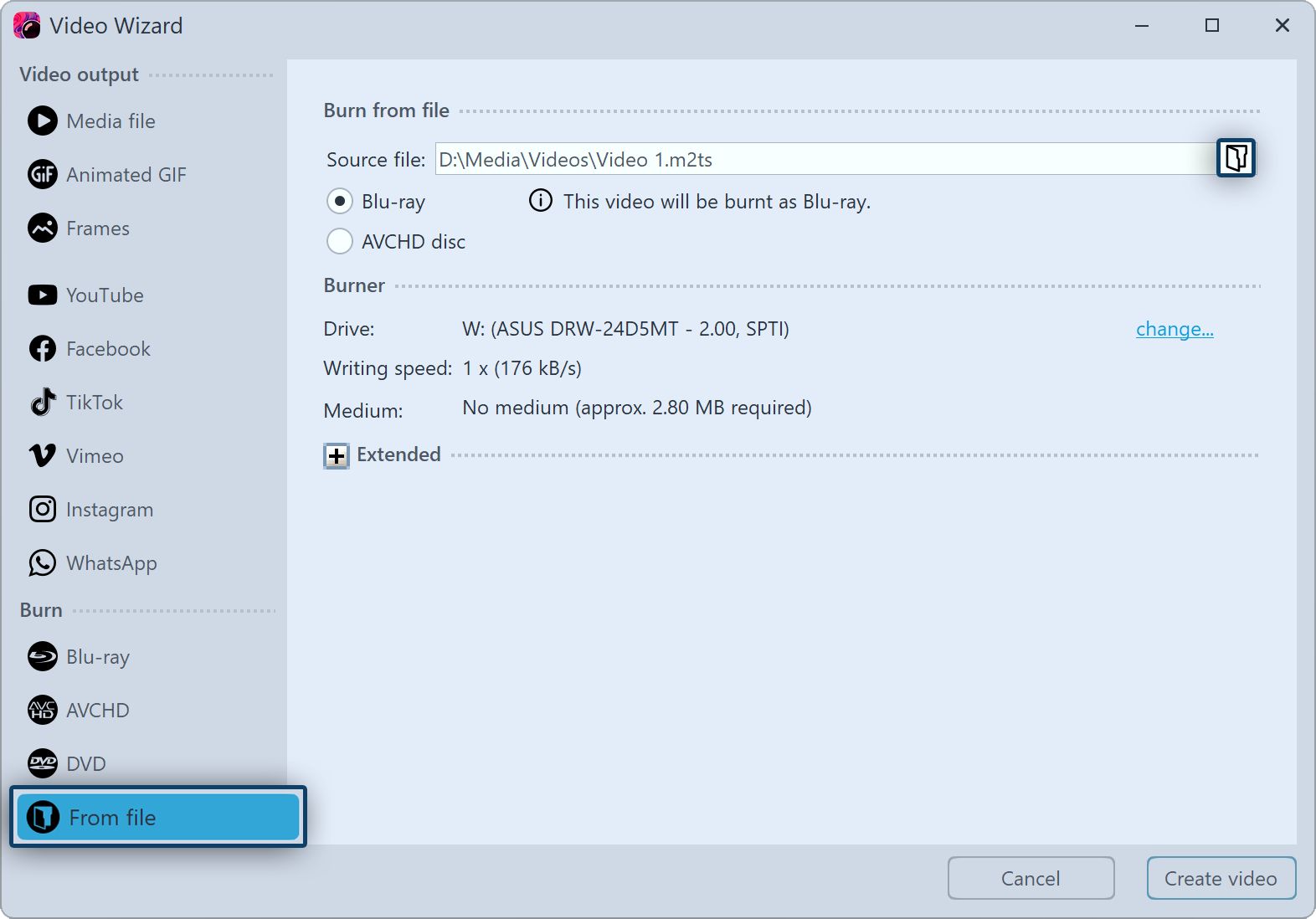 At Source file, click the small folder icon on the right. Here select a video file that you want to burn. It must be a file in M2TS format. Click Create video to start the burning process.