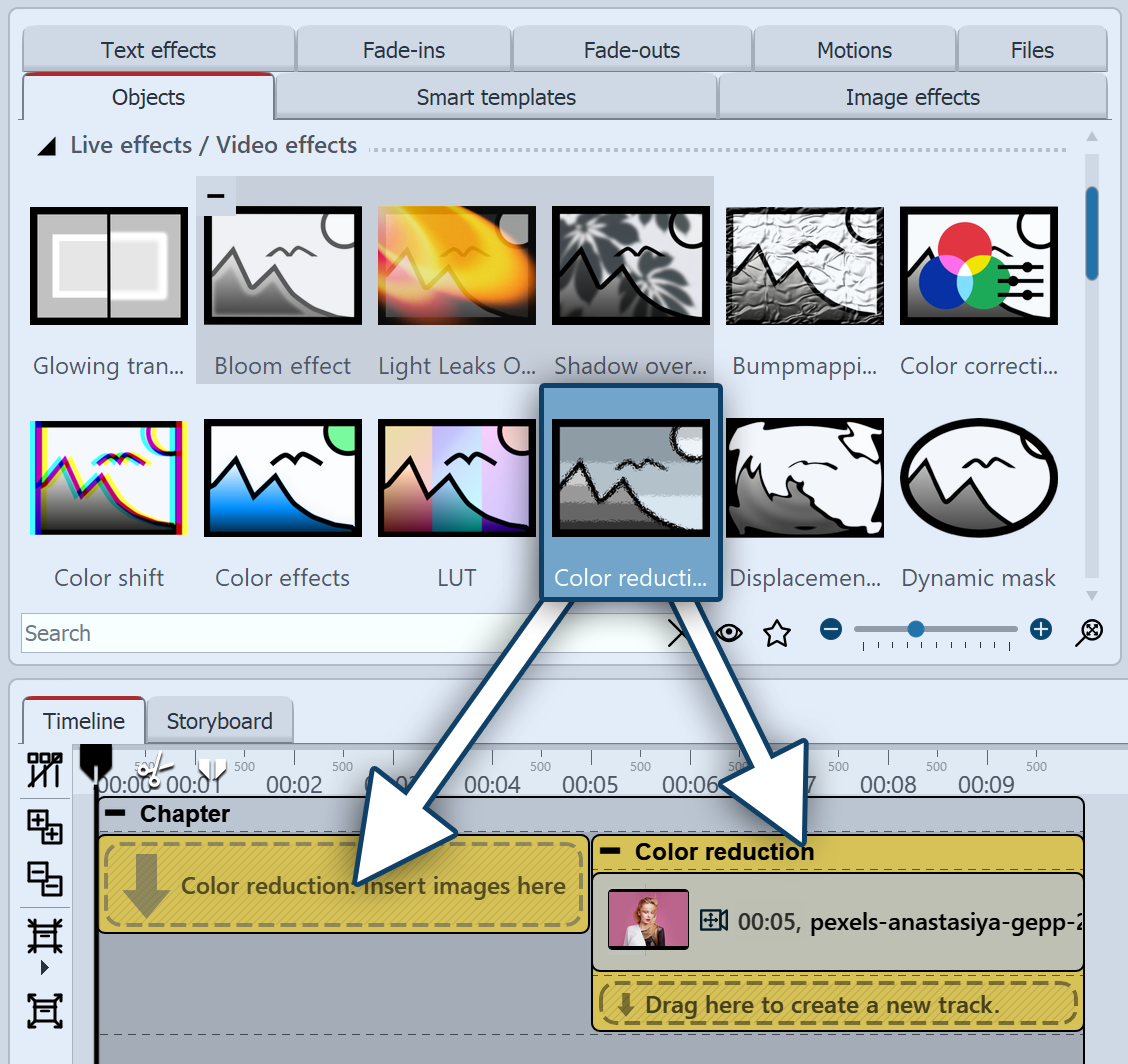 ![]() Insert "Color reduction" To use the effect, you can drag it directly onto an image in the Timeline. You can also drag the effect to the Timeline and later insert one or more images into the effect. After you insert the image, a colored frame with the title of the effect appears around the small preview image in the Timeline. When you click the colored frame, you can specify the settings for the effect in the Properties area. |