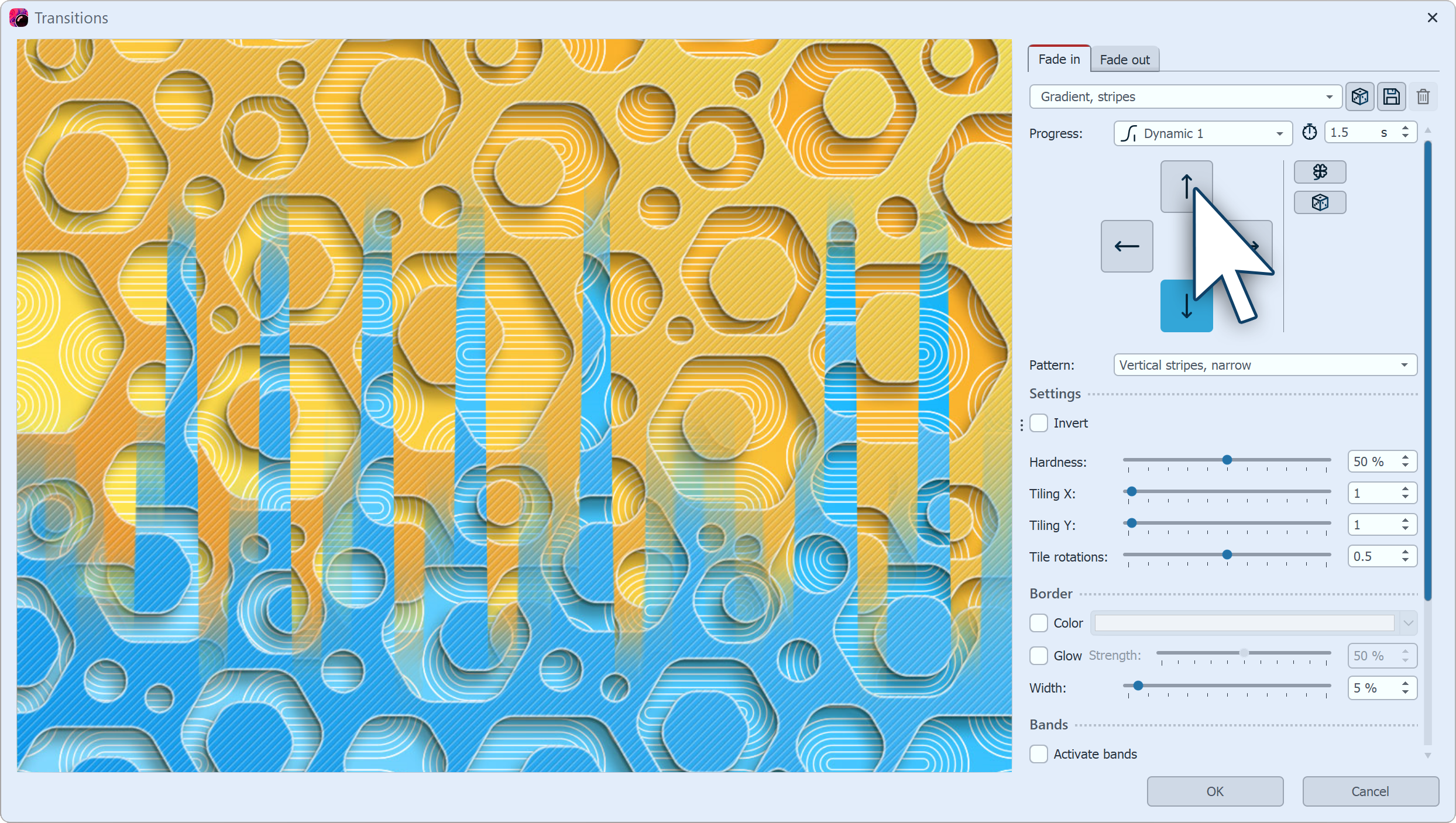 ![]() The fading in can be adapted to each case To give the images more impact, you can assign a frame. You will find frames in Toolbox in the tab Image effects. There go to the frames section and drag the image effect Unobtrusive white border onto each upright image. Assign a fading in to each image. The effect is harmonious if you use the same transition for each image. For example, you could choose the transition Course, Strips and adjust it so that the fading in extends downwards in one image and upwards in the other. |