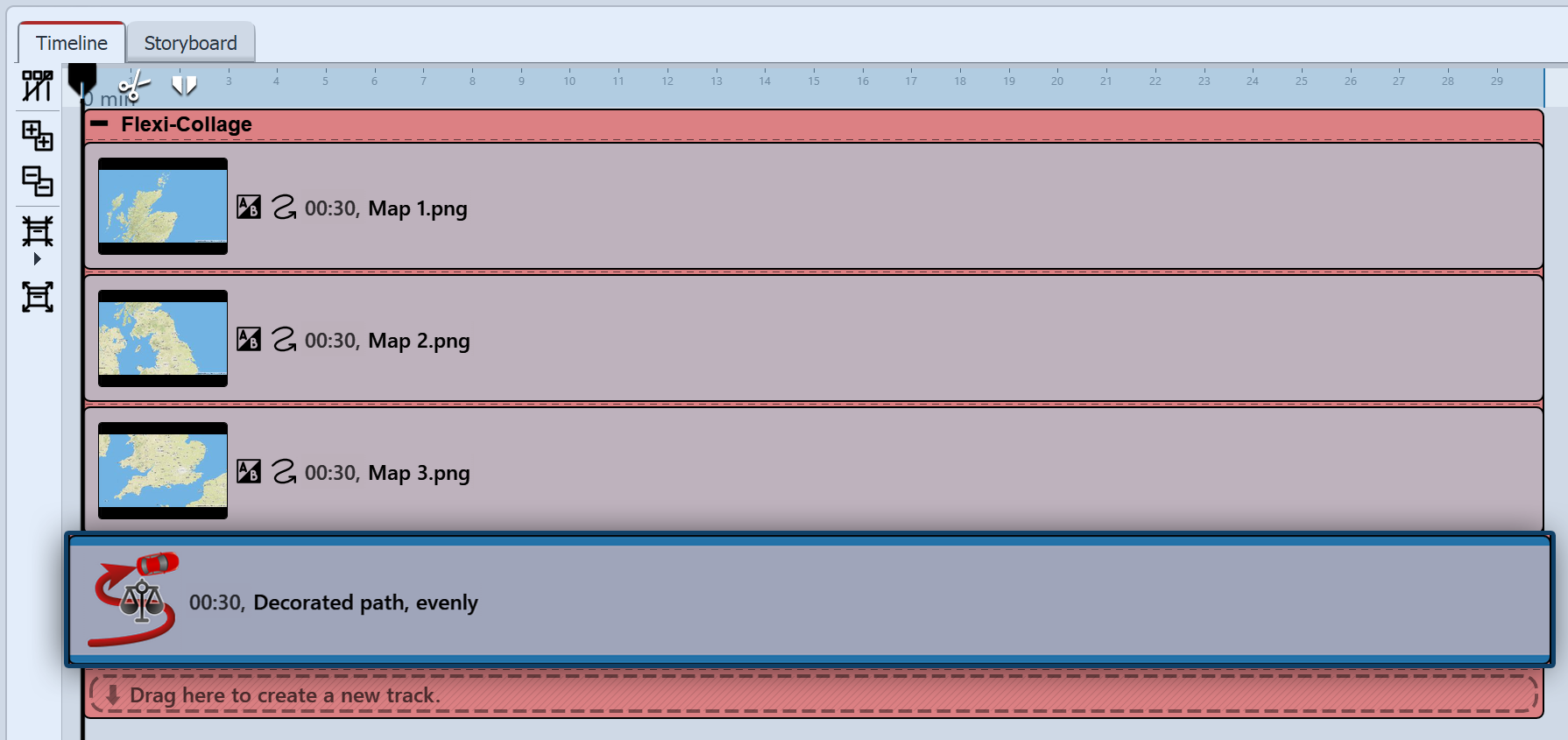 ![]() Inserting a flexi-collage Several maps should be inserted, which are combined together to form a collage. So that the map sections can later be treated as one whole object, they are grouped together in a Flexi-Collage. In the first instance, drag the Flexi-Collage from the Toolbox into the Timeline. |