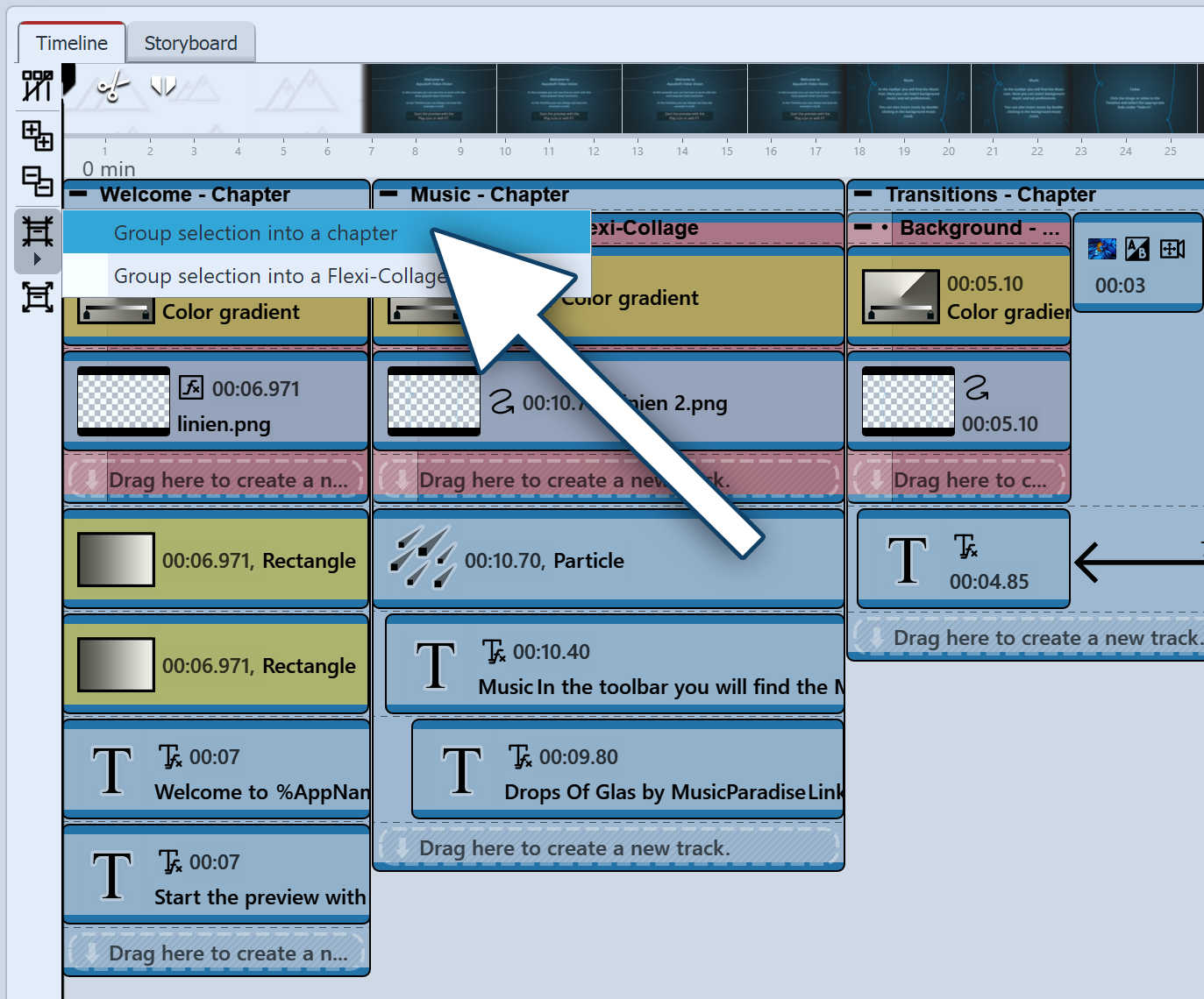 ![]() Combine selected objects into chapters First select the complete project in the Timeline. Click the Group icon on the left edge of the Timeline and select Group selection into a chapter. |
