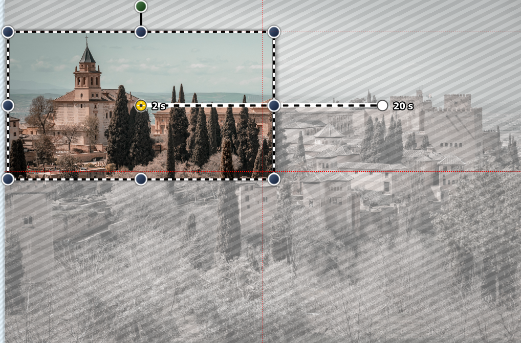 Since there are only two motion marks in thepanoramic drive in the example , the drive takes only two seconds. That's a bit fast, because the viewer should have enough time to let the panoramic ride sink in. Also, the image is usually faded in, which means it takes two seconds to be fully visible.