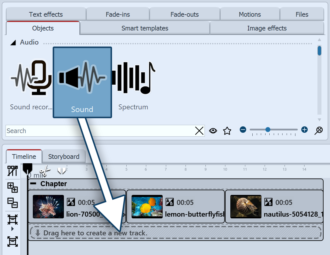 ![]() Now drag a Sound object under the image group on the "Drag here to create new track" label and select a sound file. In this way, you create a new sound track. |