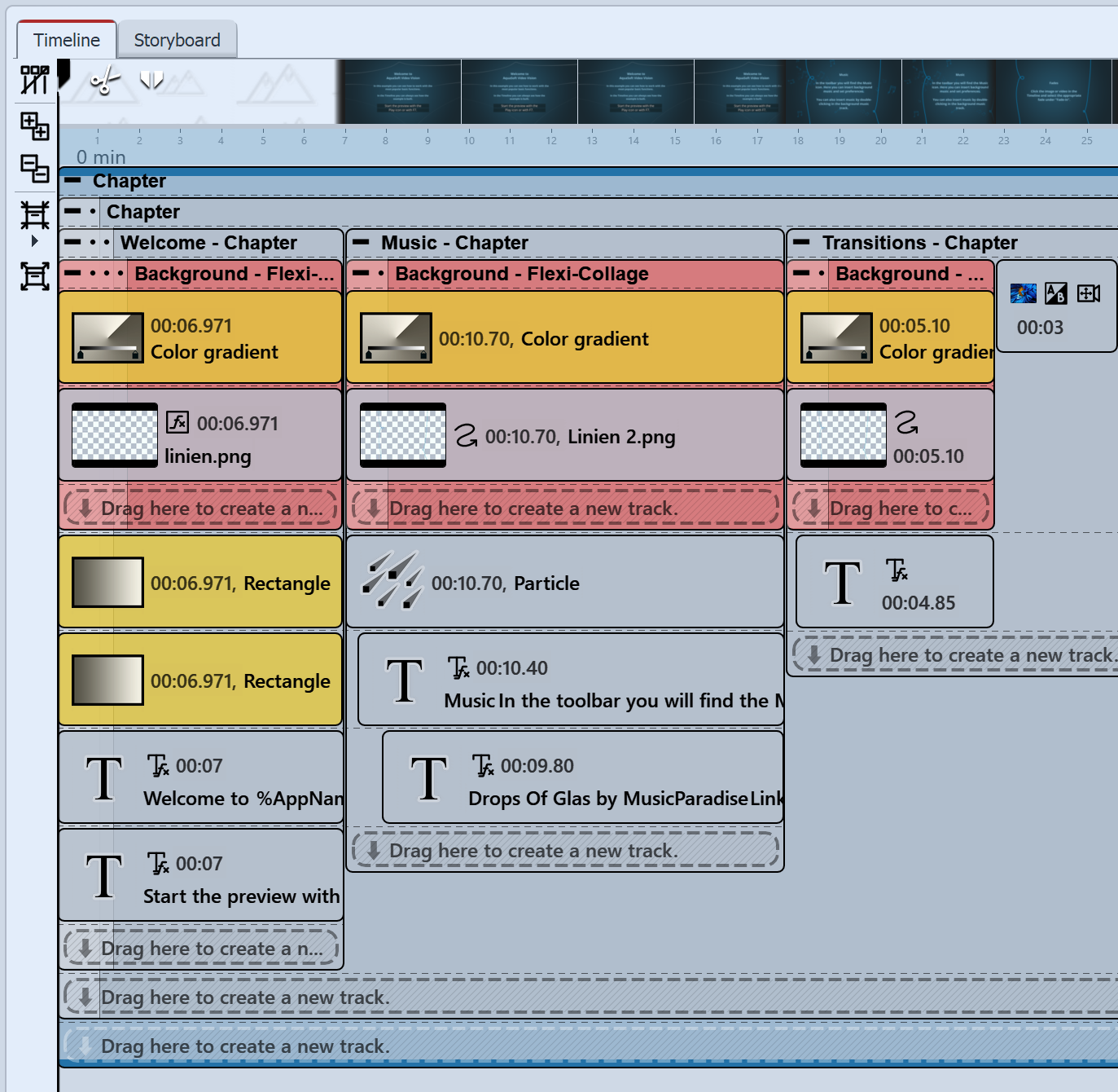 ![]() Combine selected objects into chapters First select the complete project in the Timeline. Click the Group icon on the left edge of the Timeline and select Group selection into a chapter. |