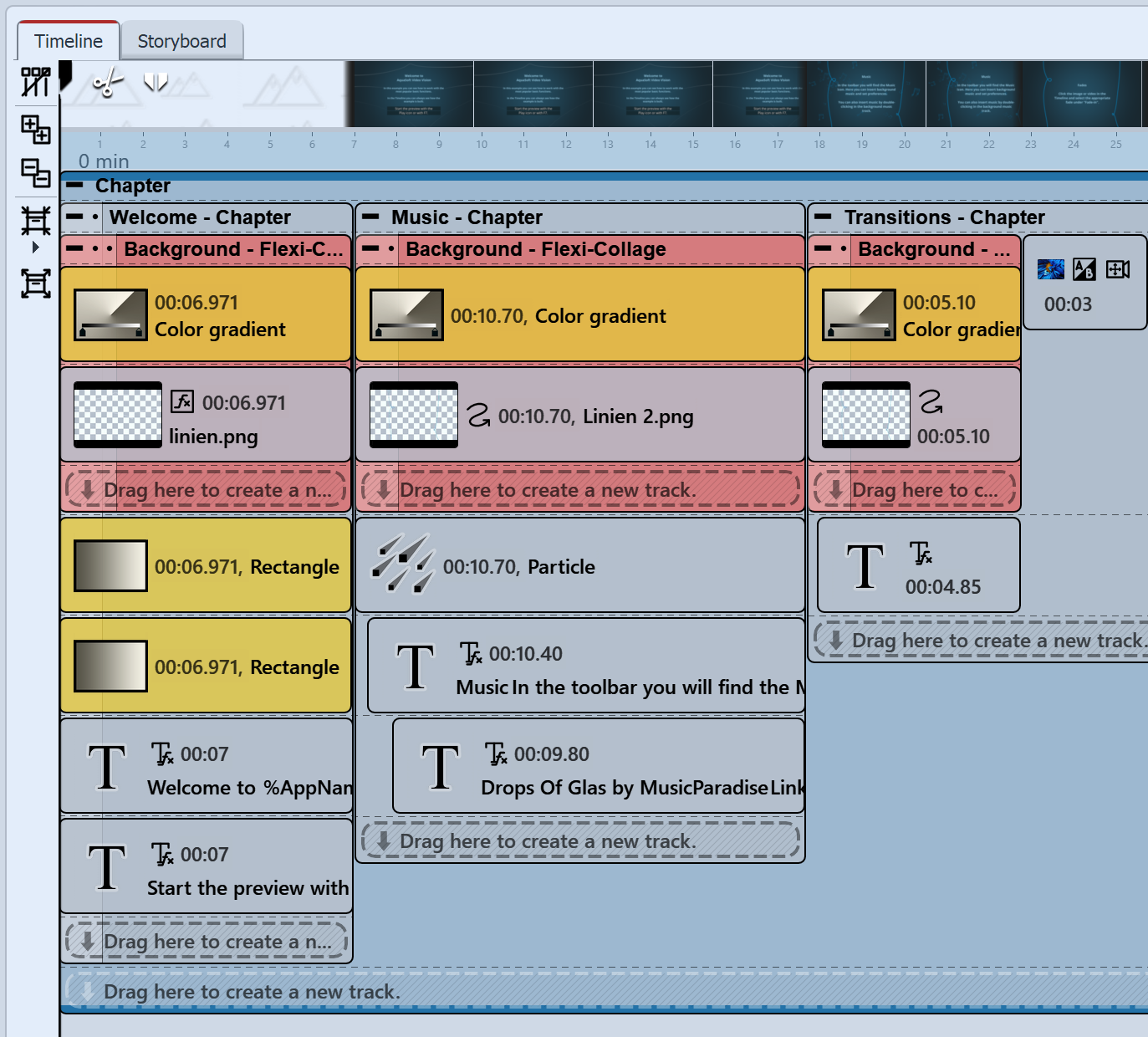 ![]() Combine selected objects into chapters First select the complete project in the Timeline. Click the Group icon on the left edge of the Timeline and select Group selection into a chapter. |