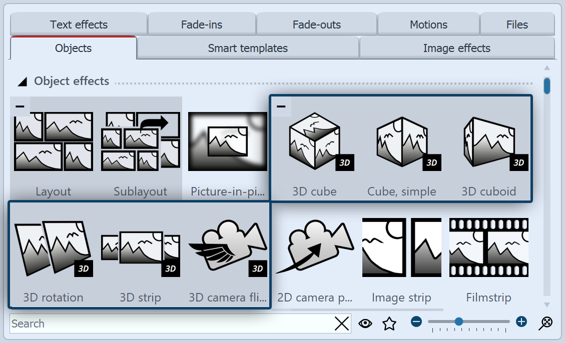 ![]() 3D cube ![]() Cube, simple ![]() 3D cuboid ![]() 3D rotation ![]() 3D strip ![]() 3D camera flight You can find the five 3D effects 3D cube, Cube, simple, 3D cuboid, 3D rotation, 3D strip and 3D camera flight in the Toolbox under the Objects tab in the Object effects section. What they have in common is that they are animations with 3D scenes. |