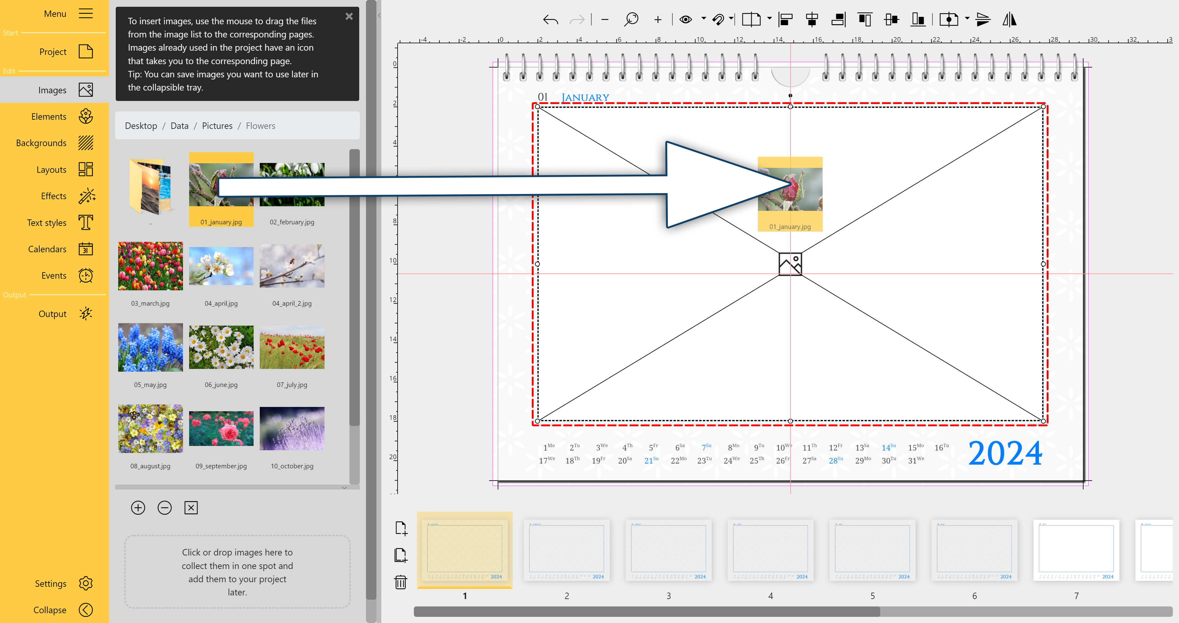 In the Page overview, select the page on which the image is to be inserted by clicking on it. If you are working with a template or layout, drag the image onto the placeholder with the left mouse button pressed until it turns white and release the mouse button. The program will crop the image.